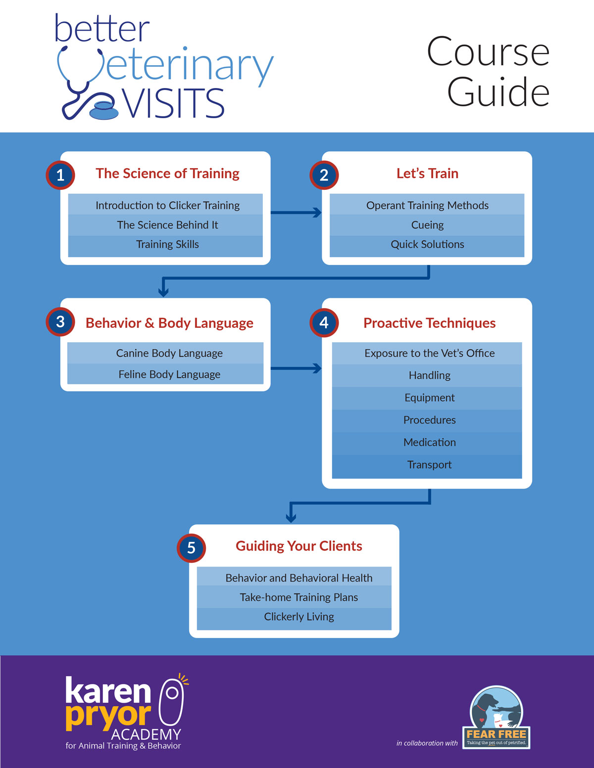 This course is designed for any veterinary professional, including technicians, veterinarians, and veterinary assistants. Trainers who work with vets, or pet owners who would like to improve their pets’ behavior during veterinary visits, will also benefit. No previous training experience is necessary.
